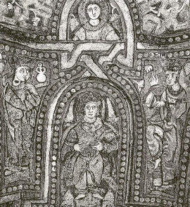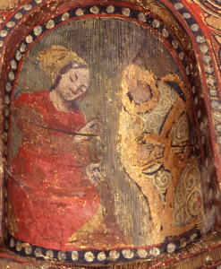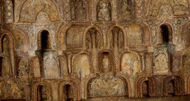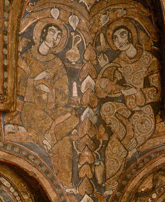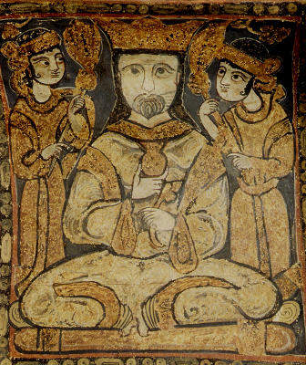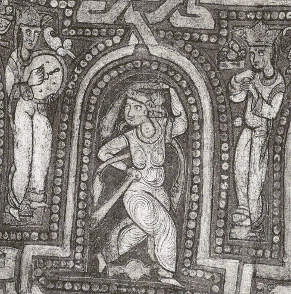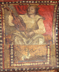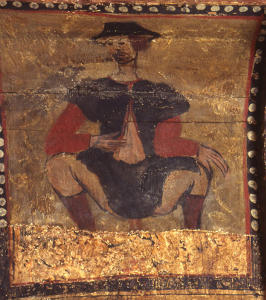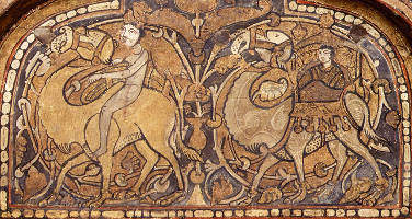 The painted wooden ceiling of the Palatine Chapel, erected by Ruggero II immediately after his coronation in 1131 and consecrated in 1140, is the only monumental-scale pictorial cycle from the Fatimid period in the Mediterranean basin to have survived in its entirety. The ceiling, made up of star-shaped polygons, is decorated with lively scenes, painted in a clean, clear style with an undeniable Middle Eastern influence, depicting dancing girls, musicians, gamblers, lions and other animals, horsemen and wrestlers, all combined with geometric and vegetal decorations. The polygons are surrounded by inscriptions of good omens in kufic script. The band between the ceiling and the walls is decorated with muqarnas.