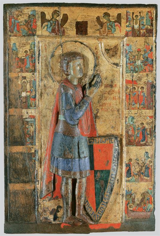 The central figure of St George the Cappadocian on the front is in relief, and scenes from his life are painted in panels around the flat frame, which is integral with the wood of the icon.