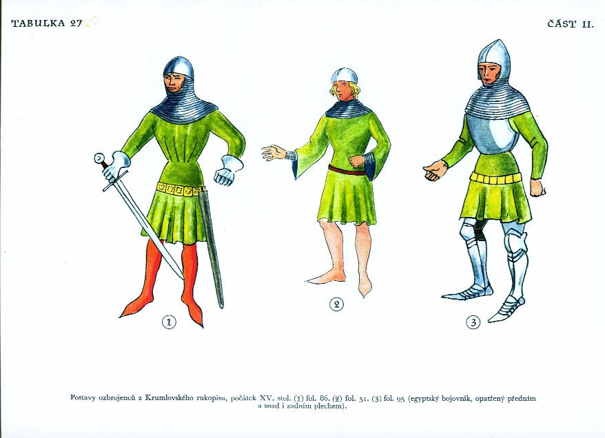 Source: Kroie, zbroi a zbrane doby predhusitske a husitske (E.Wagner, Z.Drobna, J.Dubik, Nase Vojsko, Praha, 1956) Costumes, weapons and armour of the pre-Hussite and Hussite periods.
