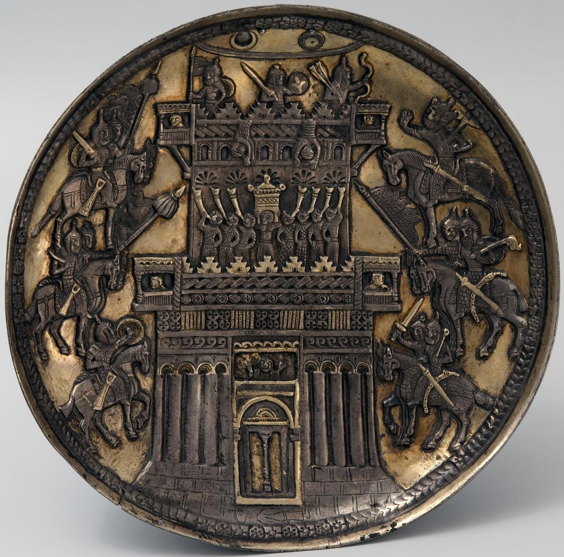 An army of heavily armoured cavalrymen, one on an armoured horse, attacking a fortress on a 9th-10th century silver plate made near the islamic frontier at Semireçye in Central Asia. (Hermitage, St. Petersburg)