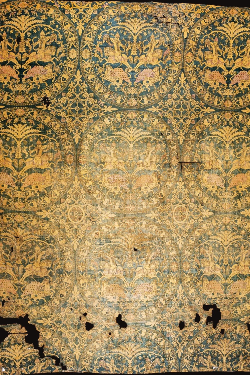 The design consists of circles with hunting scenes on horseback and is characterized by different colors such as pink and red purple, ochre, and green. It dates to between the 8th and 9th centuries, and is likely of Syrian origin.