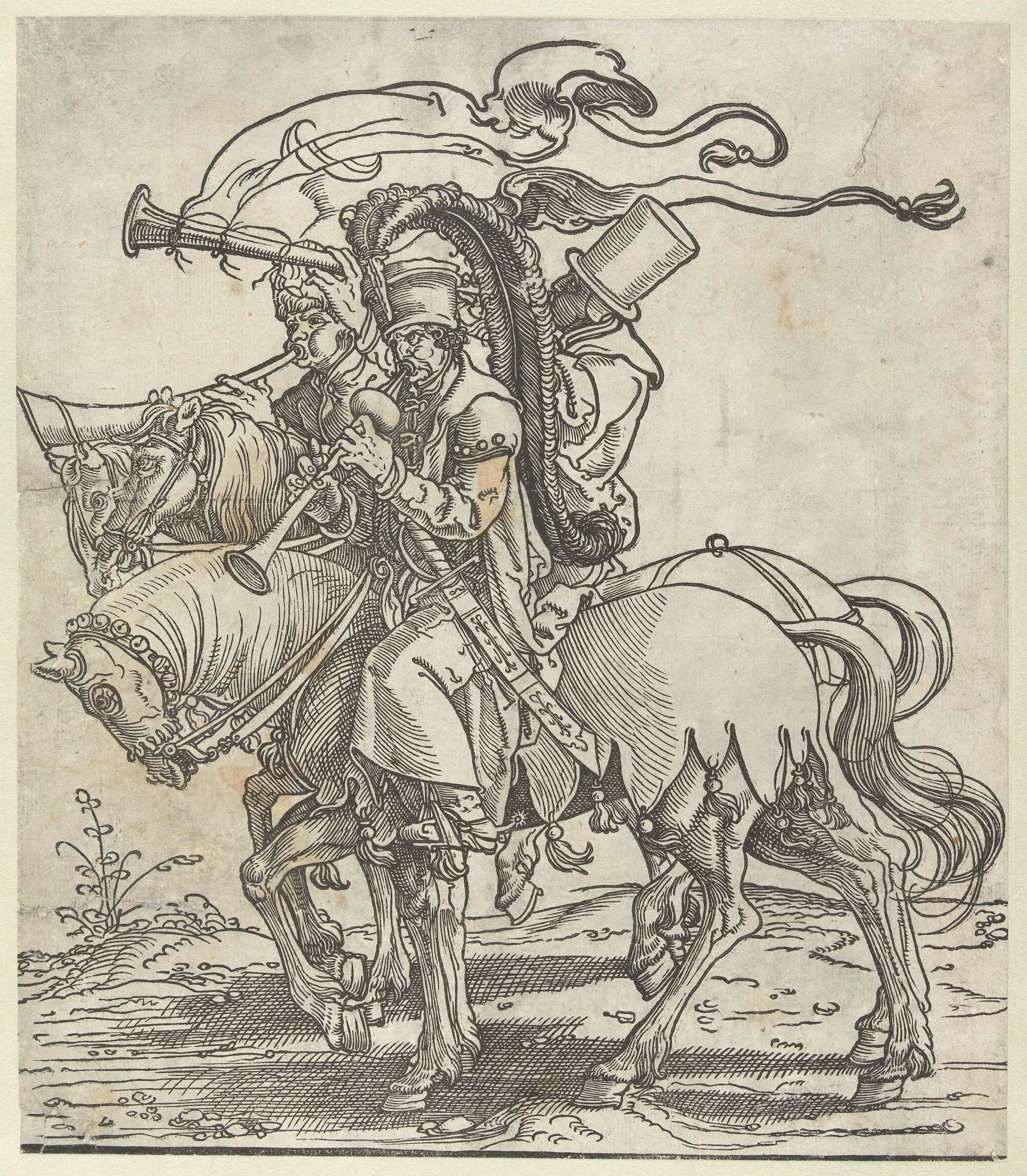 Drie trompetters te paard Jan Swart van Groningen, 1526, print, Rijksmuseum, RP-P-1950-409C Uit serie van vijf prenten met een stoet van Turken. Drie mannen te paard, blazend op drie veschillende blaasinstrumenten. Three trumpeters on horseback Jan Swart van Groningen, 1526, print, Rijksmuseum, Netherlands, RP-P-1950-409C From a series of five prints with a procession of Turks. Three men on horseback, are blowing three different instruments. |