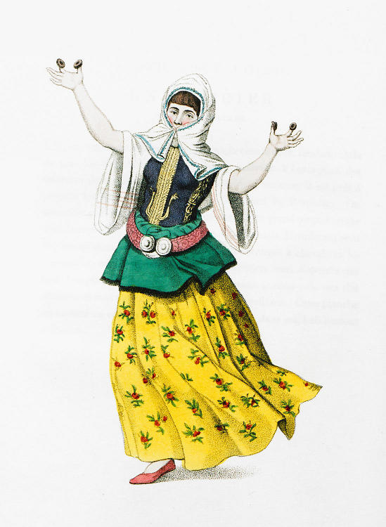 Perhaps based on Ottoman paintings made for tourists, for example Turkish female dancer in Heinrich Friedrich von Diez's Album Costumes Turcs, c.1790