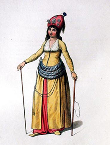 Falakacı kadın, the woman who punished wrongdoers in the Harem by beating them on the soles of their feet. Carrying a thick red staff and the cane (fala) with the loop to hold the culprits' feet.