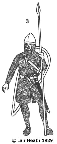 This figure, from Cagliari Cathedral in Italy, shows little real change from the last, principal difference being the addition of leg-armour. This appears at the very beginning of this era in the Bayeux Tapestry but only seems to have come into widespread use after the mid-12th century. There were two main types, one laced up the back of the leg as depicted in figure 5, the other in the form of a mail stocking drawn up to a waist-belt worn under the tunic. Such leg-pieces were called chausses, or hosen.