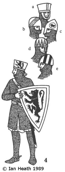 This figure is from the seal of count Philippe d'Alsace of Flanders and Vermandois, which some authorities (eg, A. C. Fox-Davies) date to c. 1181. The flat-topped helmet he wears is of a type which first appeared at about this date and was particularly popular in England by the beginning of the 13th century, 4a, from the early-13th century effigy of Geoffrey de Mandeville, Earl of Essex, in the Temple Church in London, shows the same type of helmet but with a one-piece cheek-guard attached, padded on the inside; in this instance the helmet itself stands 7" tall. A painting of Simon de Montfort (d.1218) in a mid-13th century window at Chartres Cathedral appears to show him wearing an almost identical helmet. The tabs on the back of Count Philippe's helmet seem to have remained an indication of rank now just as they had been a century earlier (they appear on William the Conqueror's helmet in 2 scenes in the Bayeux Tapestry, for example).