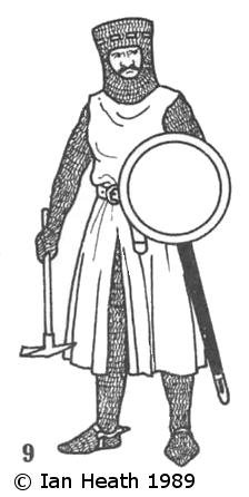 The shape of his mail coif seems to suggest that he wears an almost flat-topped helmet (or possibly an arming-cap like that depicted in 10b) underneath the coif apparently secured to it by a narrow lace or tape around the head. Exactly the same arrangement can be seen in the effigy of William Longespée, Earl of Salisbury (d.1226), in Salisbury Cathedral.